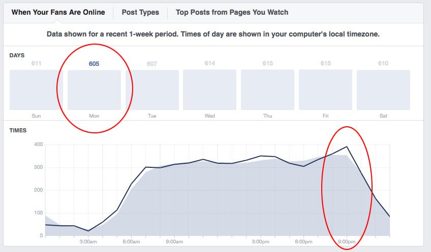 Use this report to figure out when you have the most fans online to havethe best chance of them seeing your content. In some industries, you might notice that your fans are more often online on the weekends than during the week. Roll over each day of the week to see how your fan interaction fluctuates. Looking at Tingalls insights for the 1st week in December, you'll see that our fans were most engaged on Monday between 7-9:00 PM.