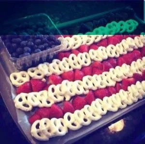 As a crazy busy mom, I love this easy and fun dish for the 4th. A nice size container of washed blueberries arranged with sliced strawberries and yoghurt dipped pretzels on a cookie sheet. So cute! The American flag looks delicious and everyone loves it!– Crystal, Accounts ManagerWhen my children were younger, we would make patriotic looking props for using in our own Independence Day photo ‘booth’. One year they even made a huge paper mural of the statue of liberty that we hung on the wall for everyone to have their picture with as they arrived. It’s a great way to keep the kids busy before the fireworks begin and everyone really gets into it – even the dog!