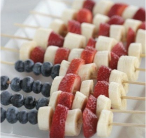 A super simple, and a super great way to make kids eat more fruit is our version of fruit-kabobs. We make them with strawberries, blueberries and bannas to create a patriotic look. Arrange them in a way that looks like the American flag – the kids eat them up!